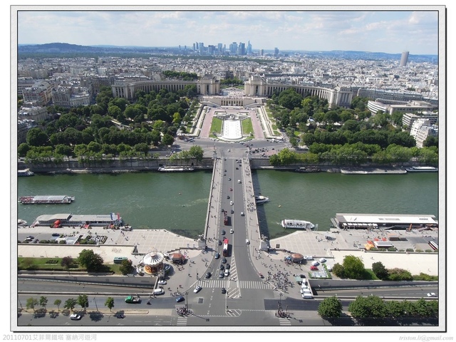 艾菲爾鐵塔二層的視野不錯,可能沒有塔頂好吧,但是也夠了!因為我覺得揺晃的幅度變大了,前方是夏佑宮(Palais de Chaillot)的中庭廣場