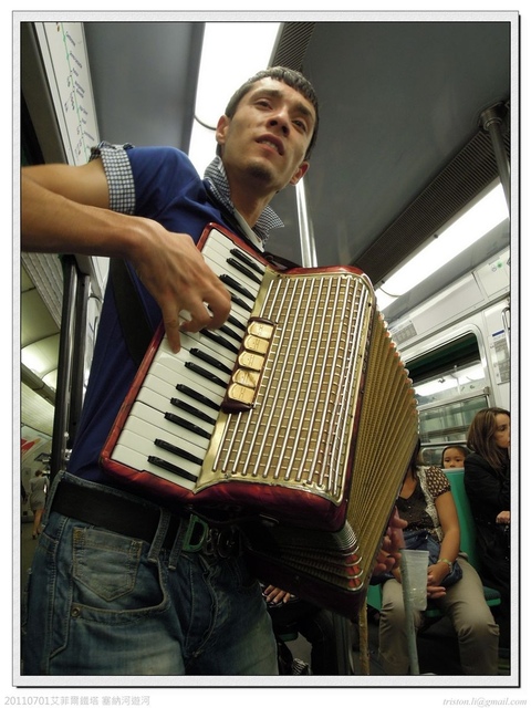 坐上地鐵六號線,車廂看起來很像台北木柵線,不會也都是馬特拉公司的吧?這條路線,觀光客特多,車廂上不時就會來個街頭藝人當場表演一下,如果喜歡就給個一塊歐元!不然,眼光還是不要直接接觸的好,不然一直任他在面前徘徊也很不好意思咧!