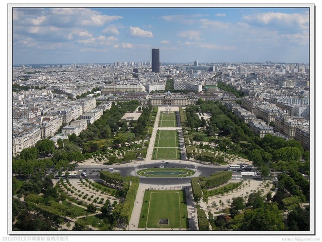 遠方的蒙納帕斯大樓號稱是巴黎第二高和最醜的建築!沿著戰神廣場的軸線,一直延伸到軍事學院,突然看到那一棟黑色的大樓,果然蠻突兀的,巴黎人向來對新來的建築都是先表示反感,然後過了幾年後就又接受它,把它當作巴黎的新地標,像艾菲爾鐵塔和羅浮宮的玻璃金字塔,唯獨蒙納帕斯大樓始終沒有平反!想來,像我這種外行人都覺得怪怪的,何況巴黎人呢?看來媒體還得多加催眠,也許過幾年也可以轉化成新美感建築標的..