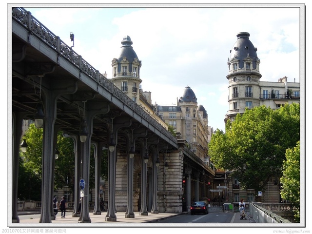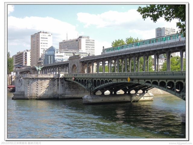 比爾海肯橋(Pont de Bir-Hakeim)有一個絕佳的觀賞艾菲爾鐵塔的角度,而且它本身的結構就充滿了美感,平面是汽車和行人通行的步道,上層則是地鐵的高架橋,水面上的橋墩也有可看之處