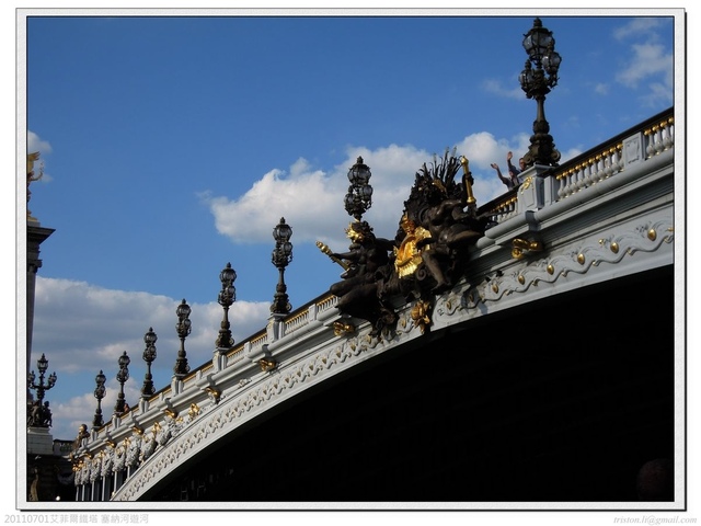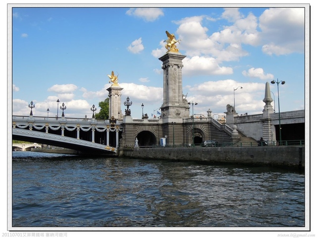 亞歷山大三世大帝橋從河面上看起來顯得氣宇軒昂,兩端橋頭上的飛馬和愛神托著的路燈襯托出整座橋金碧輝煌,諷刺的是,這座用來象徵法俄同盟的橋,是用來紀念俄國沙皇亞歷山大三世大帝,由它的兒子尼古拉二世於1896年奠基,而這座金碧輝煌的橋卻宣告了沙俄的結束!