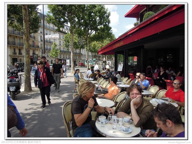 由圓頂教堂一路往艾菲爾鐵塔漫步走去,巴黎的天氣好,涼涼的,總是有一群閒人吃飽了撐著窩在咖啡店裡孵豆芽,一杯小小的expresso就呆了老半天,坐在路旁看人和被看!真不曉得他們是當地人還是遊客,當地人都不用上班哦?
