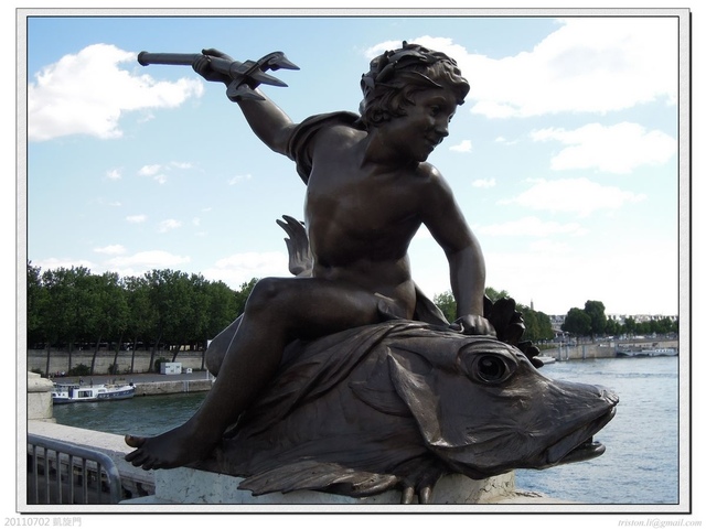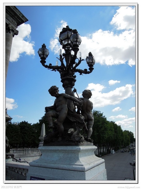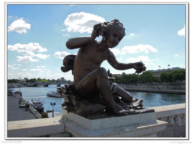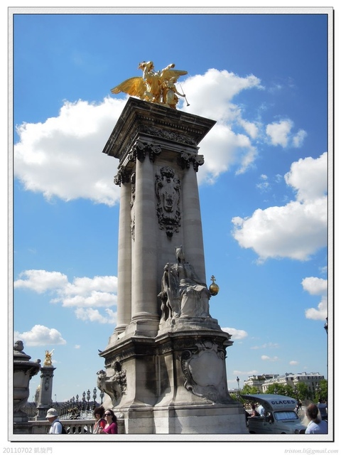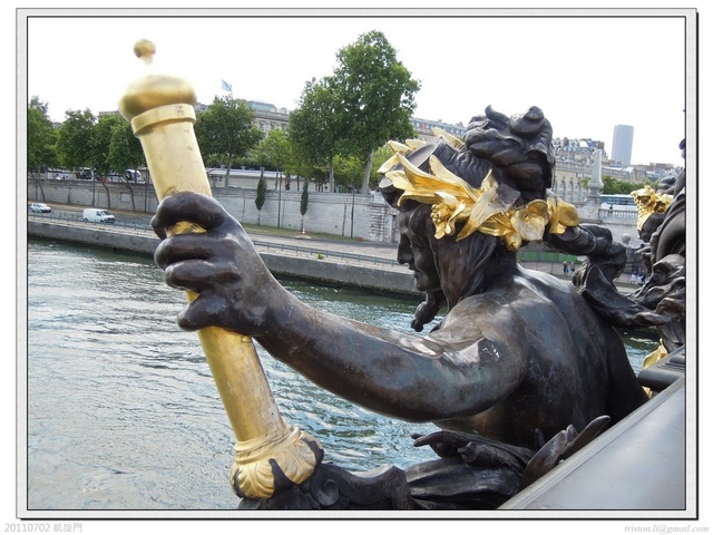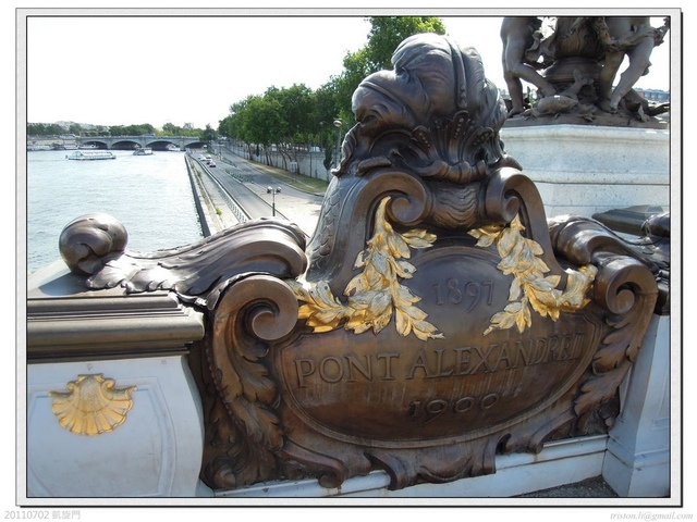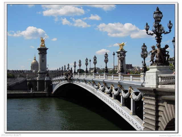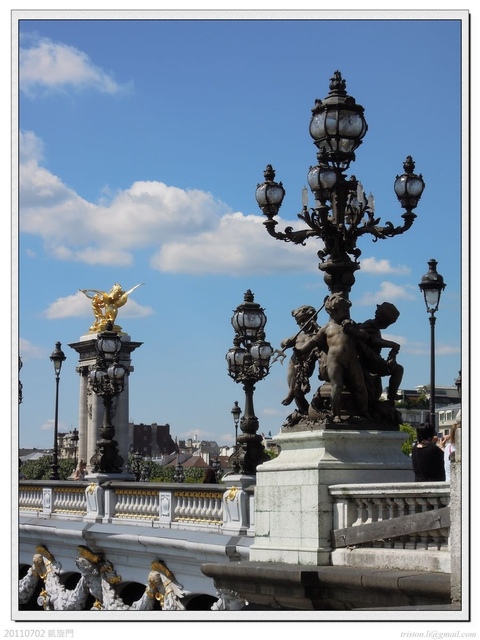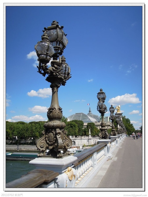 亞歷山大三世橋(Pont des Alexandre III),是巴黎最金碧輝煌的一座橋;書上說橋上的裝飾充份體現了新藝術革命的特點,我是不懂什麼新藝術革命,但巴黎的確整體浮現一股氣質,讓這些繁複的塑像浮雕顯得不突兀,就像是它本來就該這樣美的....