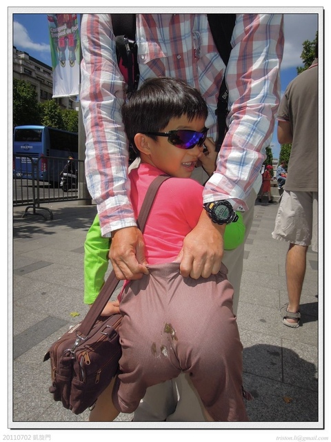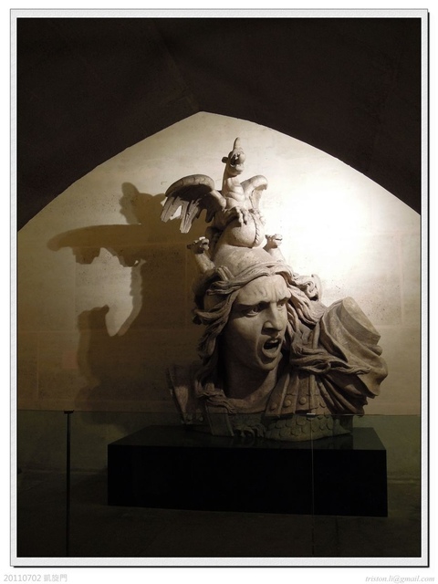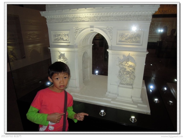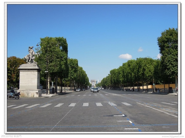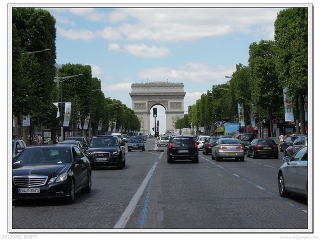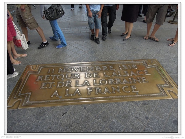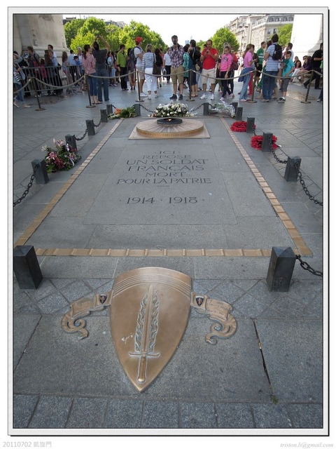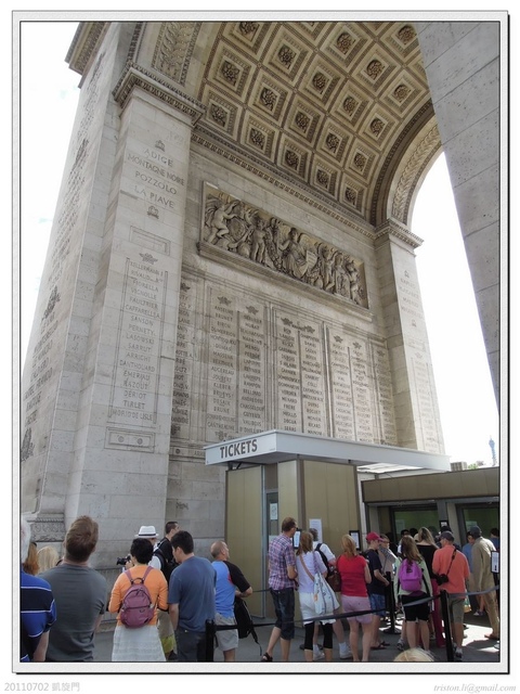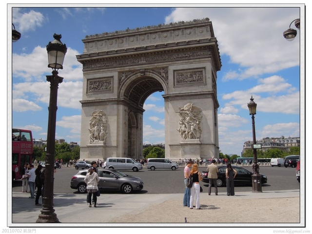 前面就是凱旋門,西元1805年,拿破崙在法國國威最盛時下令建造凱旋門,不過諷刺的是,1836年建成完工的時候,拿破崙己經二次兵敗被放逐並逝於聖赫勒拿島,四年後,拿破崙的靈柩由凱旋門迎接回榮軍院的陵墓....