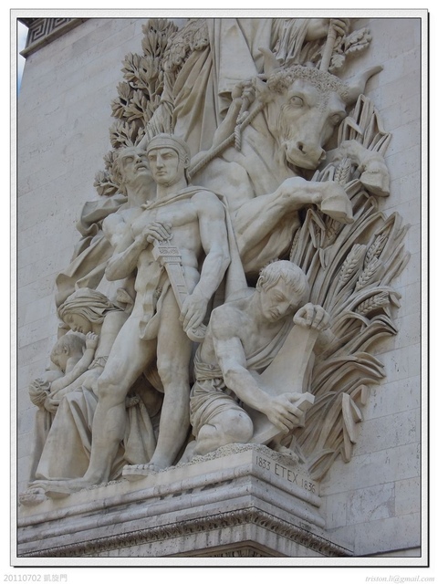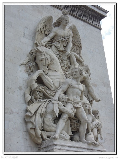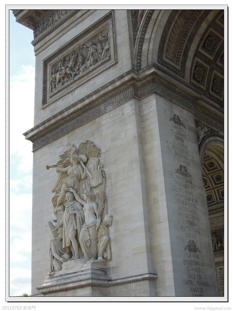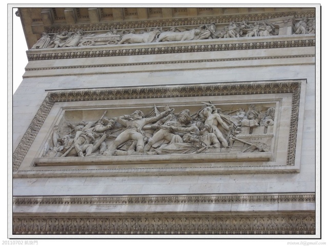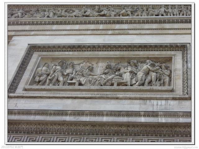 凱旋門四周的浮雕,彰顯拿破崙在位期間在歐陸各地取得勝利的情景!歐洲人奇怪的是,即使後來在兩次大戰時期,德國人入侵巴黎,倒也沒有毁了這些建築物,但如果說歐洲人比較文明或愛惜文物,他們在中東,埃及,甚至八國聯軍在圓明園可看不出他們文明的一面!