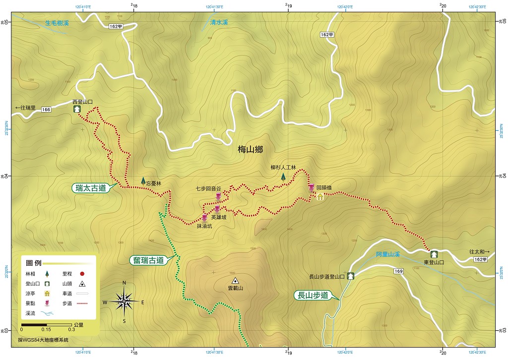 週六最好去爬山,這次來走瑞太古道,瑞太古道位於嘉義縣梅山鄉瑞里村,海拔約1000~1500公尺,民國16年,當地居民(瑞里、瑞峰、太和)為方便運送農產品及彼此的往來交通,於是開通了瑞里和太和間的步道,即今日的「瑞太古道」。瑞太古道的入口在嘉166縣道81.2K,附近有停車場,大約可以停15輛車,我們這次有三戶人家,連很少出門的籃董也知道要出來曬太陽了