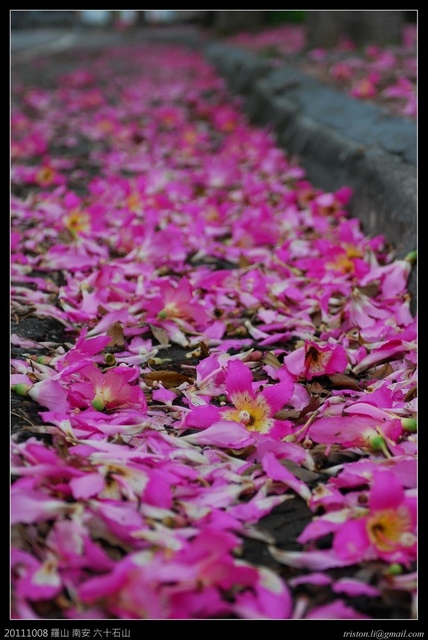 我們四點多就從台南出發,到台東才八點多,秋天真是個好季節,太陽好像沒那麼熱,早晨空氣中還有一股隨著涼風送來的花香,一時忍不住,就停下車,拍拍路邊行道樹的落英繽紛!