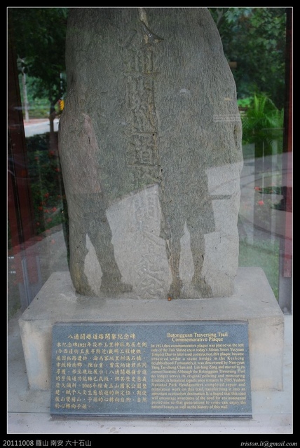 東起花蓮玉里,西至南投竹山的八通關古道,原本是日本人為了理蕃所開闢的古道,1921年完工的時候,曾在玉里鎮上立了"八通關越道路開鑿記念"。後來遺佚了幾十年,才被重新發現,立在現在南安遊客中心的對面。