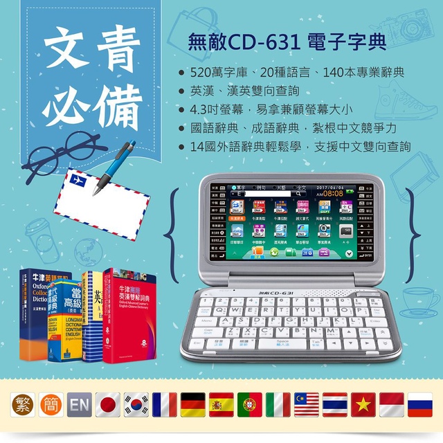 裡頭有十四國語言的辭典,太強了,為什麼沒有電子字典藥丸呢?只要吃顆藥丸,就可以打通任督二脈,這樣不用說這台電子字典定價五千多,一顆藥丸如果要十萬,我都買了啦!英日文不知學多久了,還是吚吚喔喔吔!就我常會查詢的外國語言來說,大約是英文和日文吧!當然無敵Besta CD-631電子字典也有些東南亞和歐洲語系(義德西法)的,只是我用不到啦!等準備把我老婆升官再說吧!