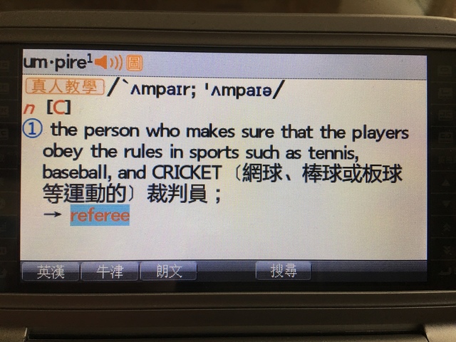 再續查,也可以查到相對字referee的意思...也是裁判員,但其實兩者有點差異,umpire是make sure that the platyers ober the rules,而referee是who controls the game,兩者雖然中文都是裁判,但在英文還是有點差異,因為有英英雙解才會了解其差異