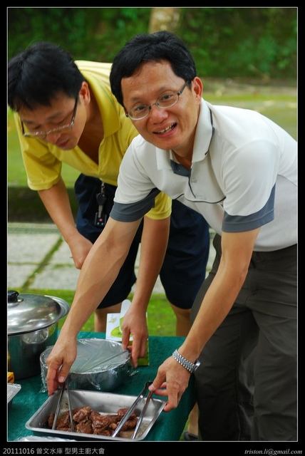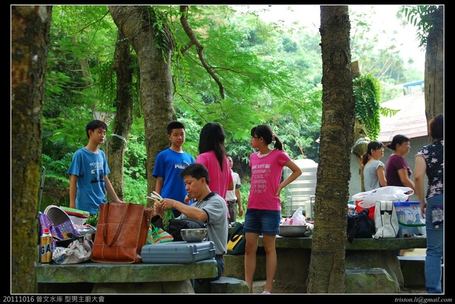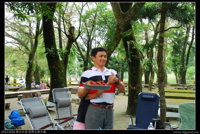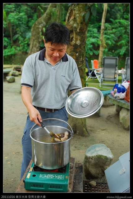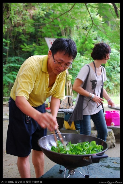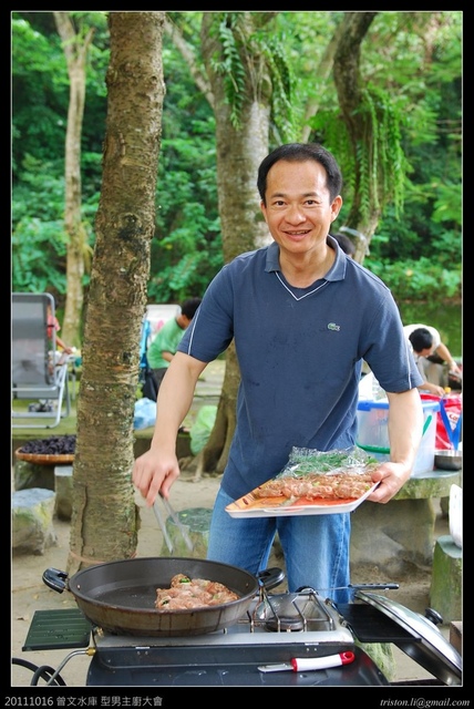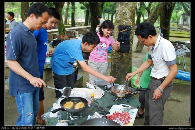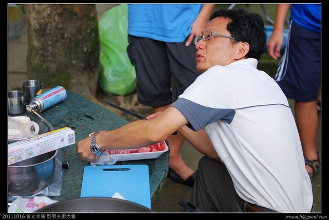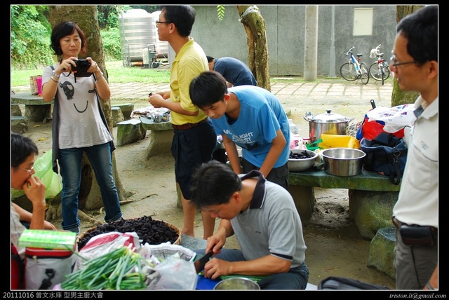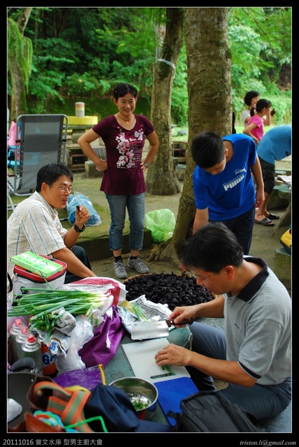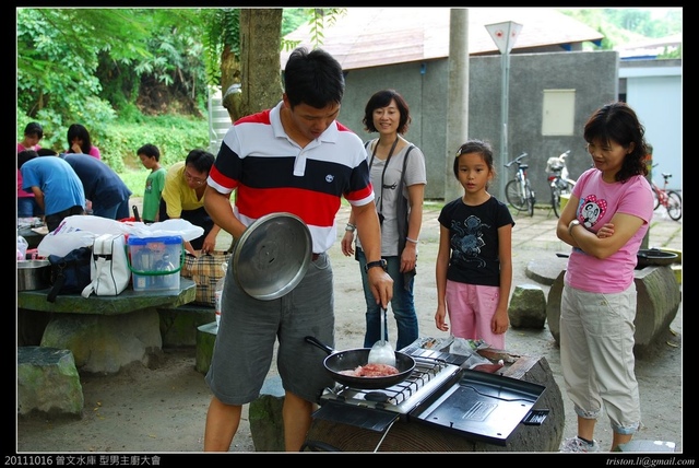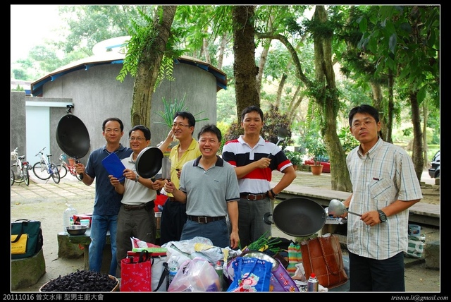 今天的公演地點在曾文水庫東口露營區秘密花園,遊戲規則是每家男主人弄出兩道菜,一定要動火動鏟!很難嗎?現在事過境遷真覺得沒什麼,但前兩天真的有點壓力,畢竟,我們這群型男雖然有人是董事長,有人游手好閒,有人在公務機關任職,還有人務農,但個個是君子,除了少數不肖男人,絕大多數都是遠庖廚的嘛!更何況,今天可不是自己在家胡亂炒個菜,是要被公審的!夠嗆的吧!