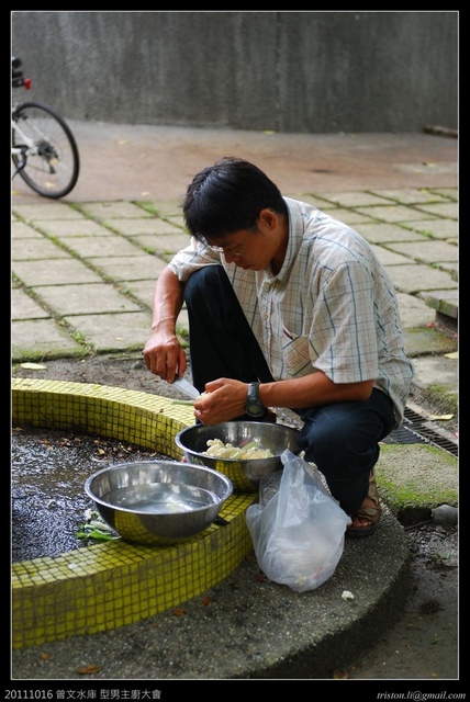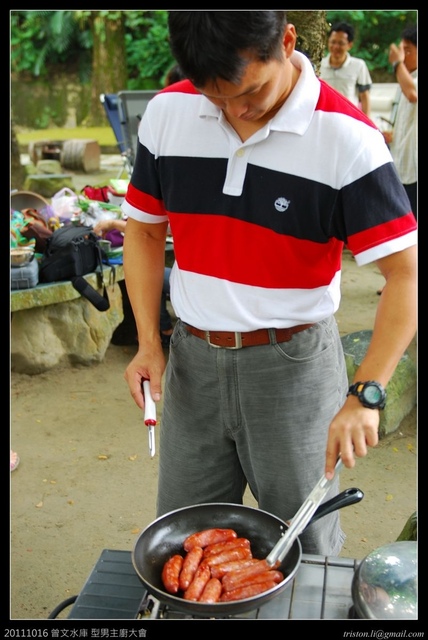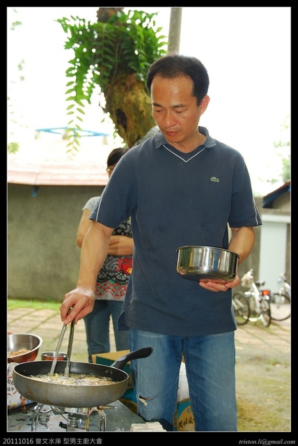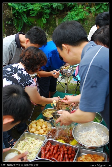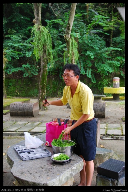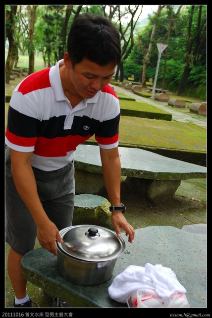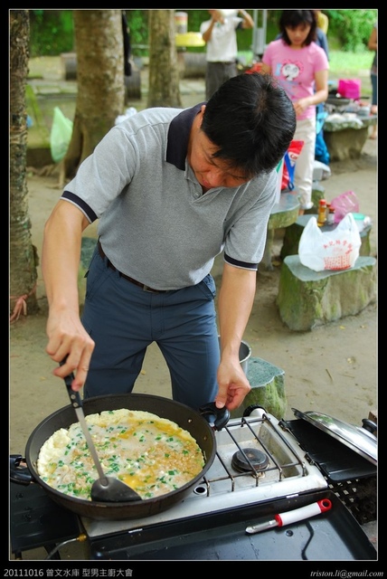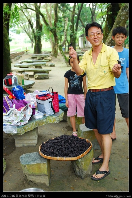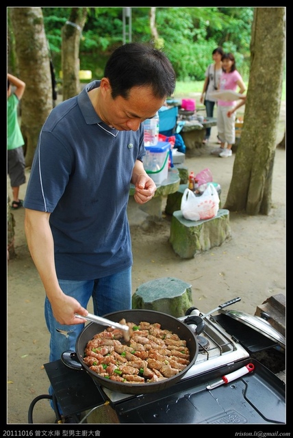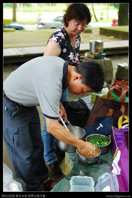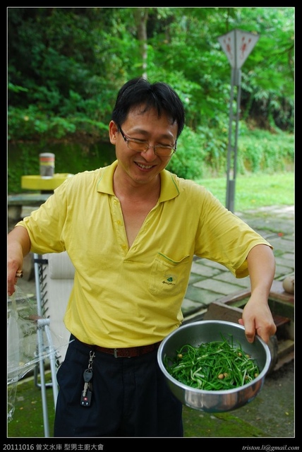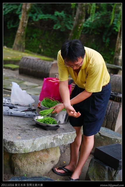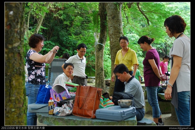 今天的公演地點在曾文水庫東口露營區秘密花園,遊戲規則是每家男主人弄出兩道菜,一定要動火動鏟!很難嗎?現在事過境遷真覺得沒什麼,但前兩天真的有點壓力,畢竟,我們這群型男雖然有人是董事長,有人游手好閒,有人在公務機關任職,還有人務農,但個個是君子,除了少數不肖男人,絕大多數都是遠庖廚的嘛!更何況,今天可不是自己在家胡亂炒個菜,是要被公審的!夠嗆的吧!