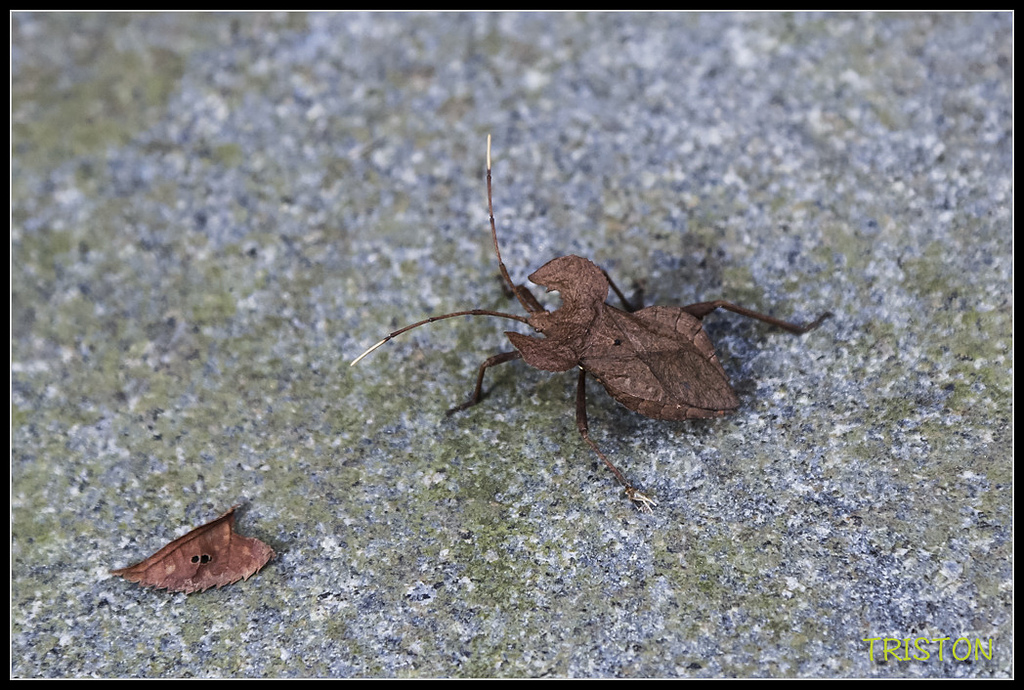 褐異緣椿象和外觀近似月肩奇緣椿象,但月肩奇緣椿象後腳脛節寬扁,內側不具稜突,所以猜這是月肩奇緣椿象