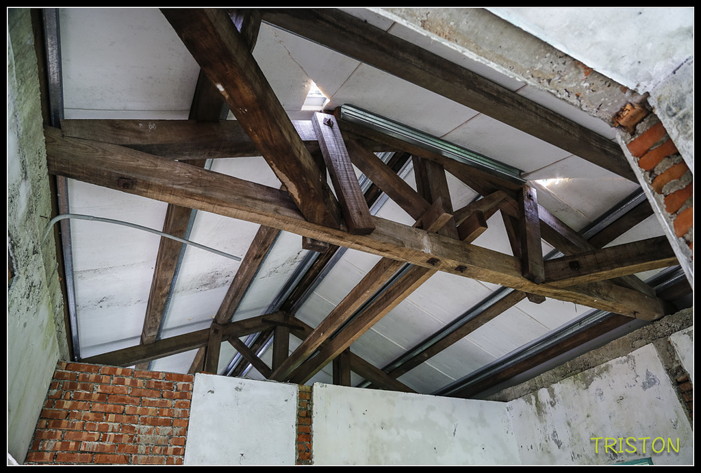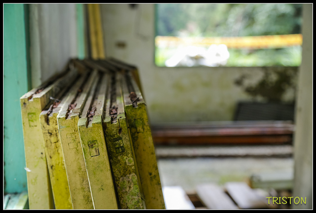 室內窗框被卸在一旁,有一手推車,這裡也曾是工程人員的休息之處