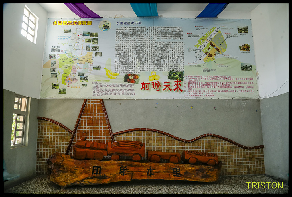 候車室裡有點空蕩,只有牆上的旅遊導覽圖和木製的"印象水里"...國民政府遷台之後,以外銷木材換取外匯,振昌興業的孫海標得丹大林區的開採權,因為車埕村有鐵路運輸交通便利,所以選擇車埕村做為基地,整個水里也順勢成為木材集散之中心,目前水里地區仍保留一些木材的加工廠,如車埕的振昌興業股份有限公司(林班道商圈)等