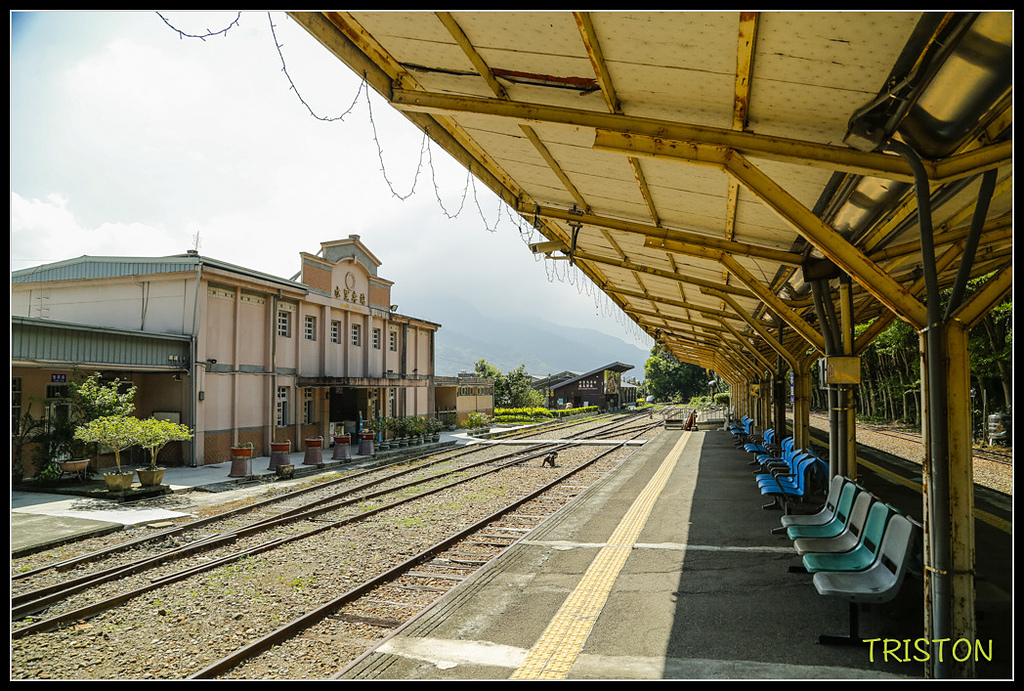 走進月台,月台上保留著舊式的Y字型遮雨棚。Y字型遮雨棚可以讓雨水降下後水往中間集中後流出,這樣雨水就不會往兩邊流出淋濕旅客