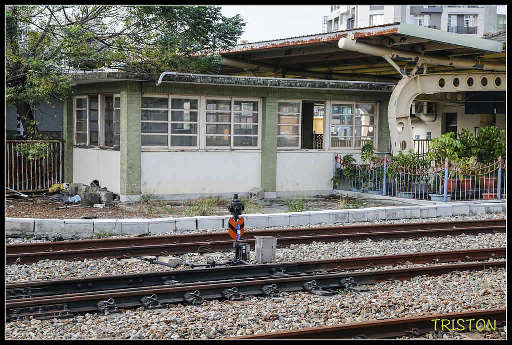 這裡也有舊式轉轍器指示燈,其中藍圓板一白線和藍燈為定位,而黃翼板和橘燈為反位。鐵軌平常開通的方向稱為定位定位常為幹線,通常是較順的一邊,也就是會直走,反之則為反位,反位常為支線,通常是較不順的一邊,也就是不會直直走。所以目前鐵軌設定為定位,走幹線...