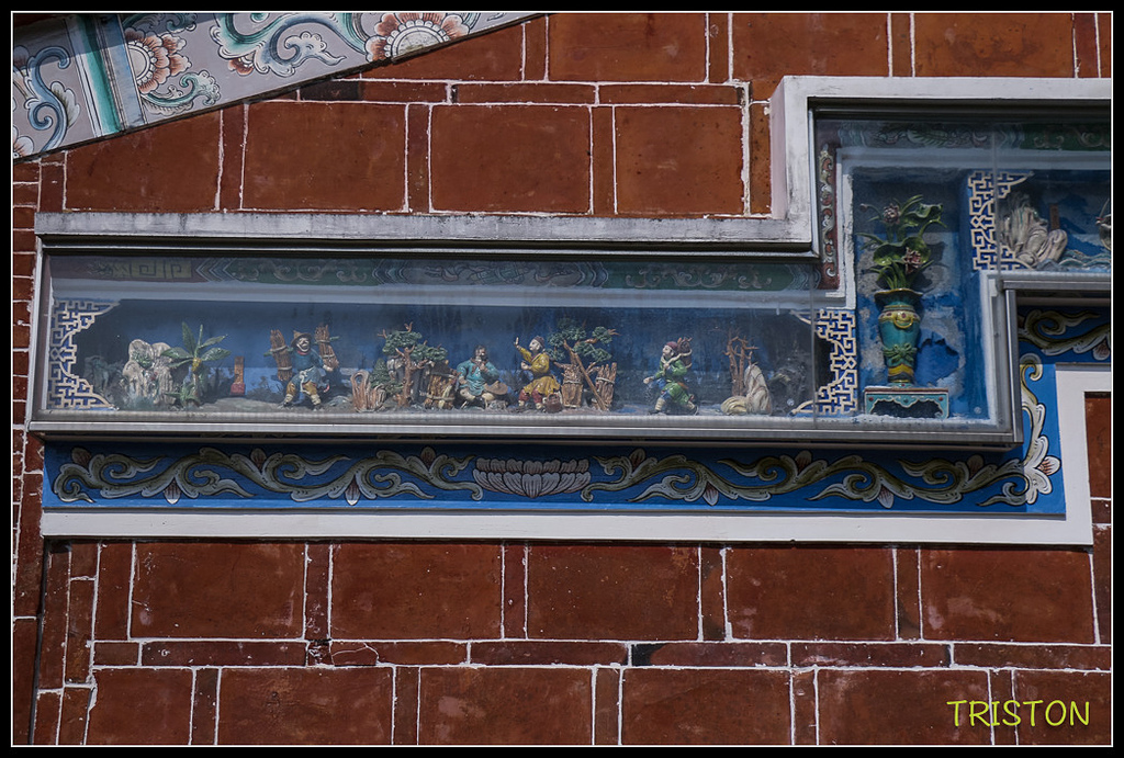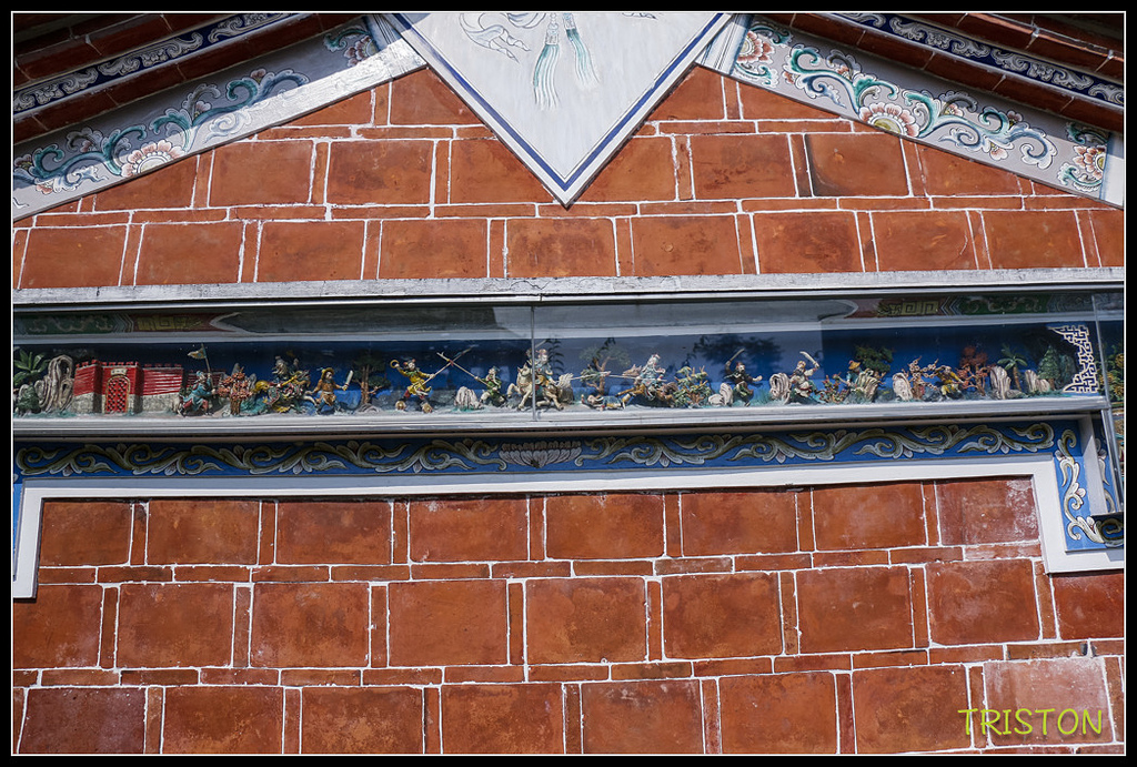左過水廊門肩的交趾陶作品,有桃子、葡萄、香蕉、蓮霧......等水果,很可愛