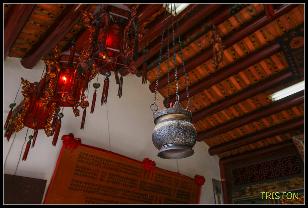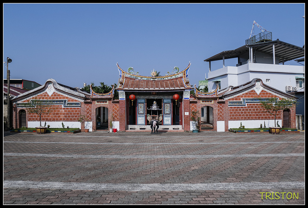 前殿中央之大門由「三關六扇門」之格扇門組成,門上的門聯寫著「朝上啟蒼穹神靈安眾赤,林中施法雨德澤頒群黎。」