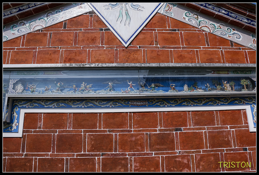 右過水廊門罩下有很可愛水產類交趾陶,感覺令人玩味,一般蟹有登科甲之意,花枝與蚌就較少見
