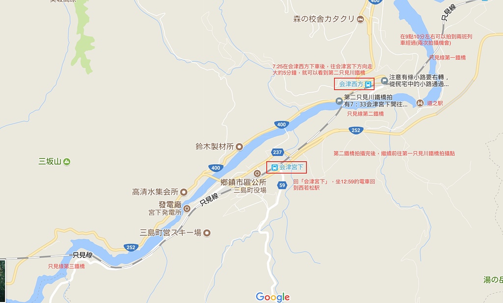 在會津檜原站及會津西方站中間的「第一只見川鐵橋」是我們的目標,網路上有許多攝影攻略,建議攝友在下一站會津宮下站下車,再沿國道252走回到「第一只見川鐵橋」,但我細看並分析時間後發現不必如此,只要7:25分在前一站會津西方站下車,就有可能在有限的時間內,連拍兩座鐵橋!在這裡,時空的疊合點是重要的資源