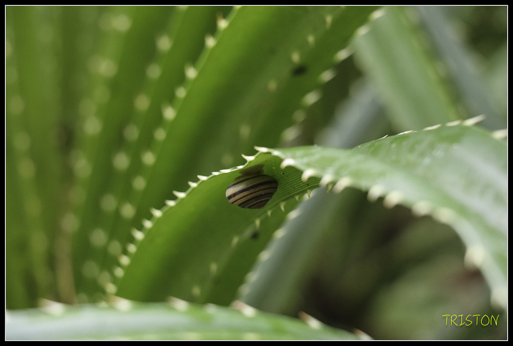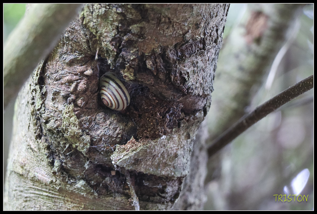 在林投葉下有隻"阿猴蝸牛Satsuma bacca"。很有趣的名字
