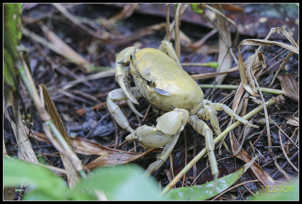 我們由鎮南宮一旁的水泥產業道路上山,沒多久就在路旁看到黃灰澤蟹。黃灰澤蟹是台灣特有種,屬於淡水的陸蟹,牠的卵直接發育孵出小螃蟹,因此不需要到海邊釋卵,可以生活在較內陸的環境。