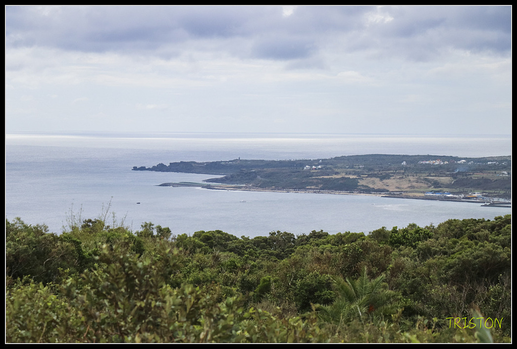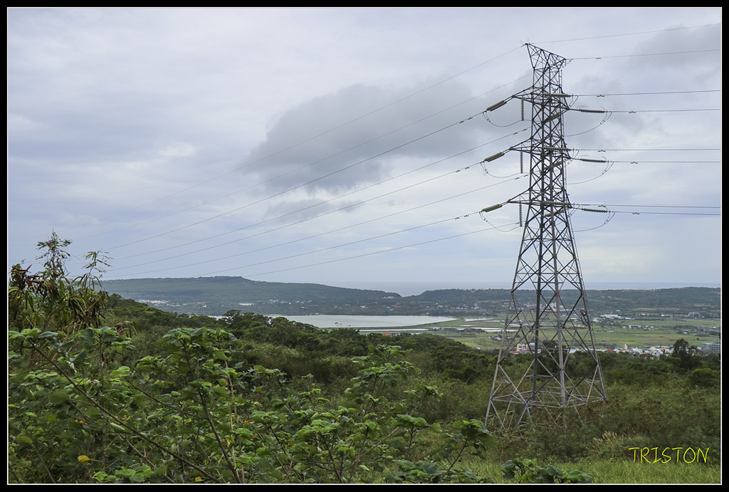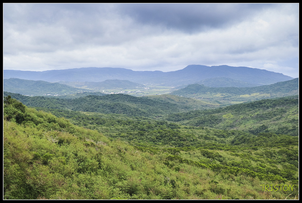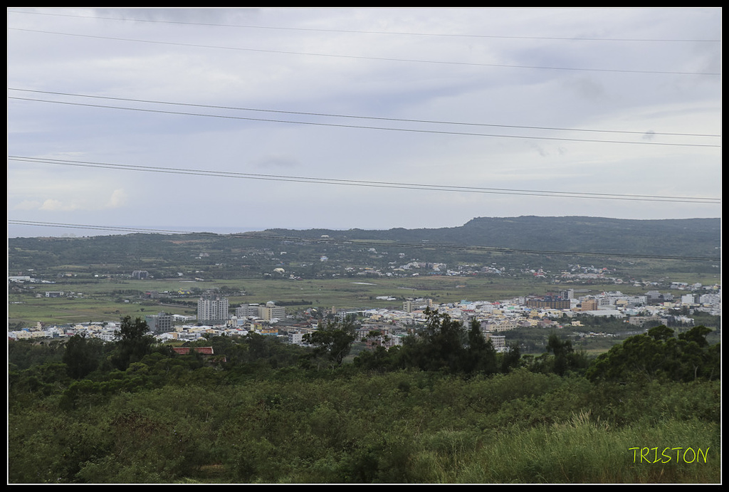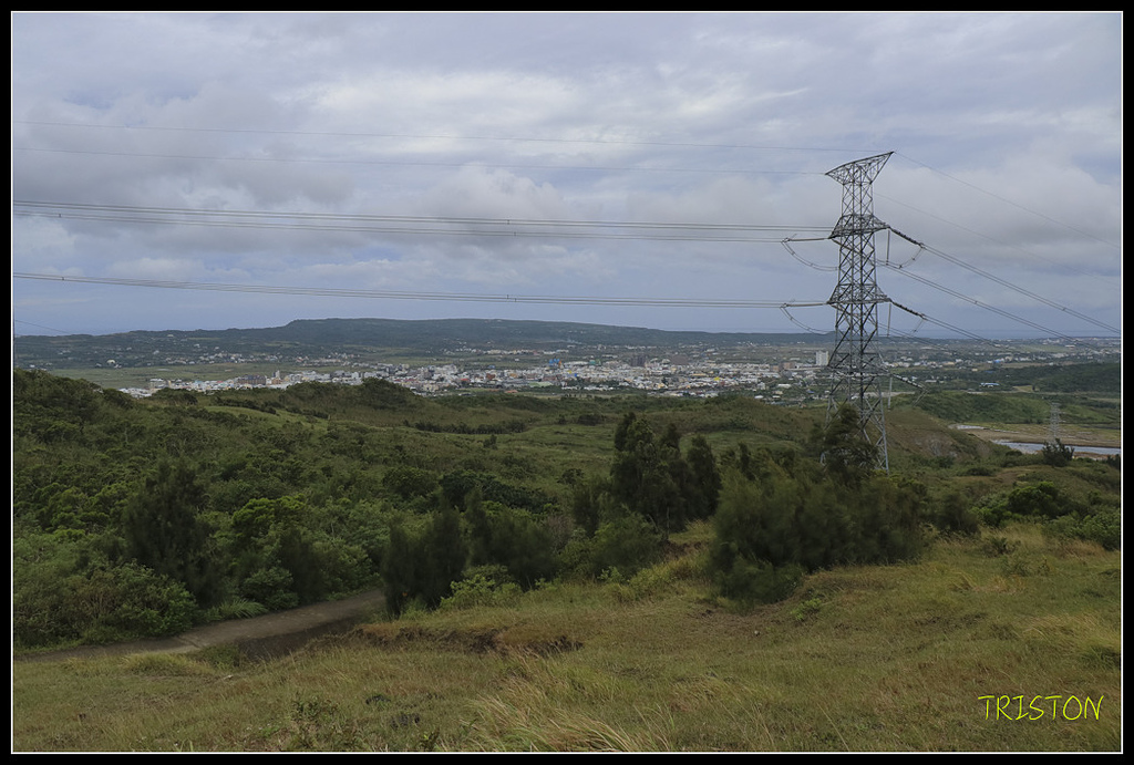 由赤牛嶺的山頂西瞰恆春城和遠方的太平頂、電塔後的龜山