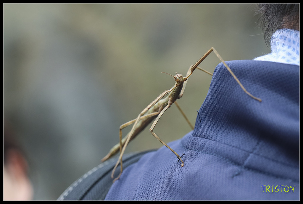 在某位隊友的身上突然出現一隻長約十公分的竹節蟲,可能是"顆粒短肛竹節蟲",短觸角及身體佈滿顆粒