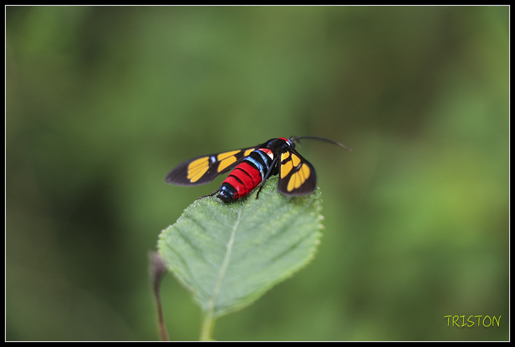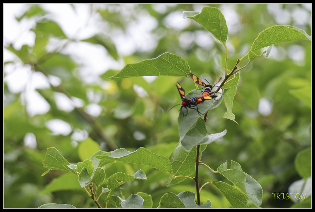 在葉子上發現一隻有夠鮮豔的,紅腹鹿子蛾,乍看外形很像具攻擊性的胡蜂,原來牠的外觀是擬態為胡蜂的樣子,蠻囂張的,一點都不怕被吃掉就對了,虛張聲勢也是生存之道哦