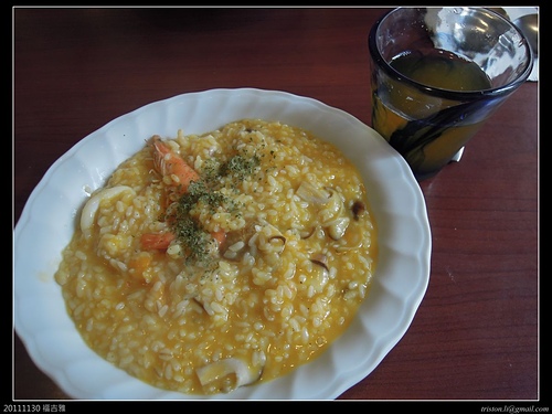 海鮮南瓜燉飯,沒有湯,附一杯茶,飯上得挺快,原本以為燉飯要花一點時間,不過大概十分鐘就來了!