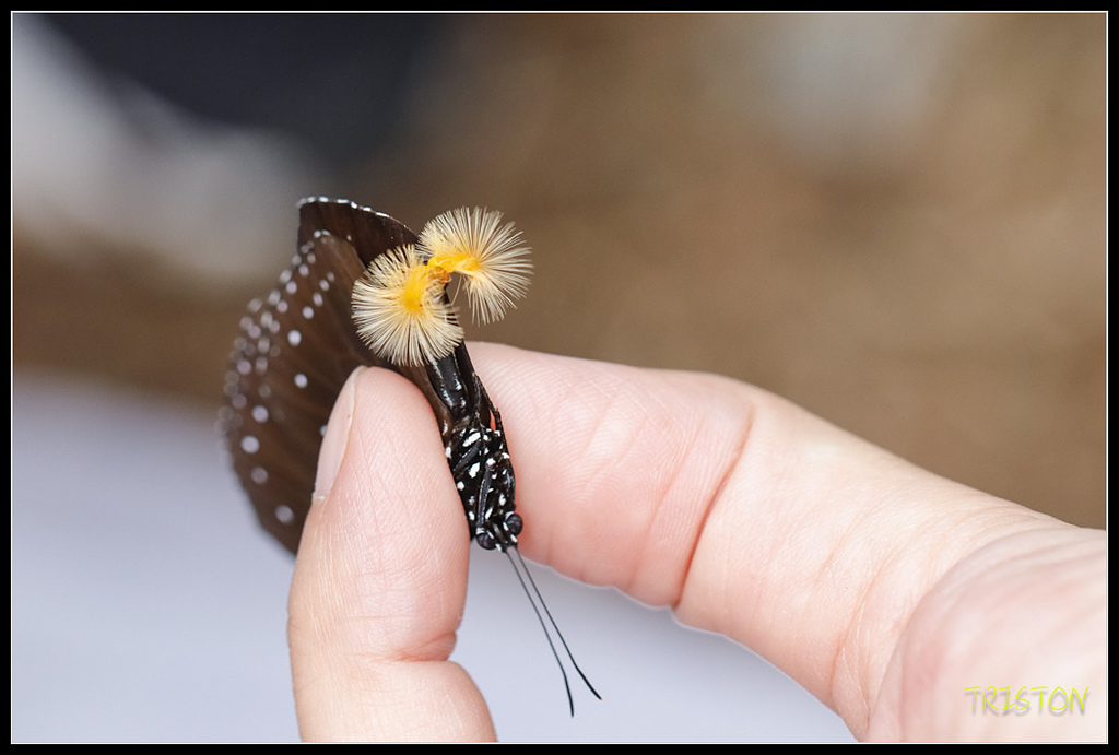 請蝶會的老師講解,解釋紫斑蝶的黃色毛筆器(Hair pencils)。只要是「斑蝶科的雄蝶」大部分都有毛筆器,平時收摺在腹部末端,求偶時便翻出。特殊且美麗的『毛筆器』與性狀特徵,可以區別雌、雄,紫斑蝶的毛筆器和性狀特徵又以斯氏紫斑蝶最為顯著。紫斑蝶雄性毛筆器對周遭環境刺激是相當敏感的,不管是在飛行嬉戲時、求偶過程中甚至是受到驚嚇,毛筆器就會立刻裸露出來,同時也散發出獨特的氣味,而每種紫斑蝶的毛筆器形狀特徵不一樣,散佈出的氣味也不同,這氣味正是種間之差異性區別,也是吸引雌蝶進行求偶交尾重要味道,被捕捉時也會外翻做為驅敵之用。紫斑蝶們會憑著相同或相似的味道來成群聚集,這正是形成紫斑蝶大量集體一起過冬的重要因素。