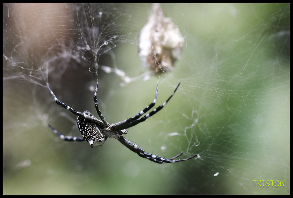 泉字雲斑蛛,雌蛛護卵,卵囊形似紡錘狀。黑色的身體,和上次在新化看到的綠色個體不太一樣