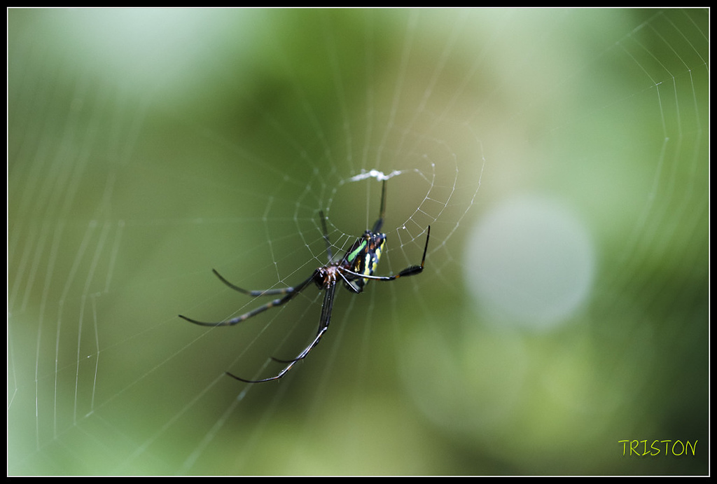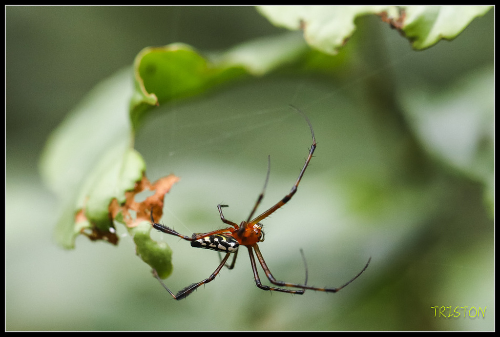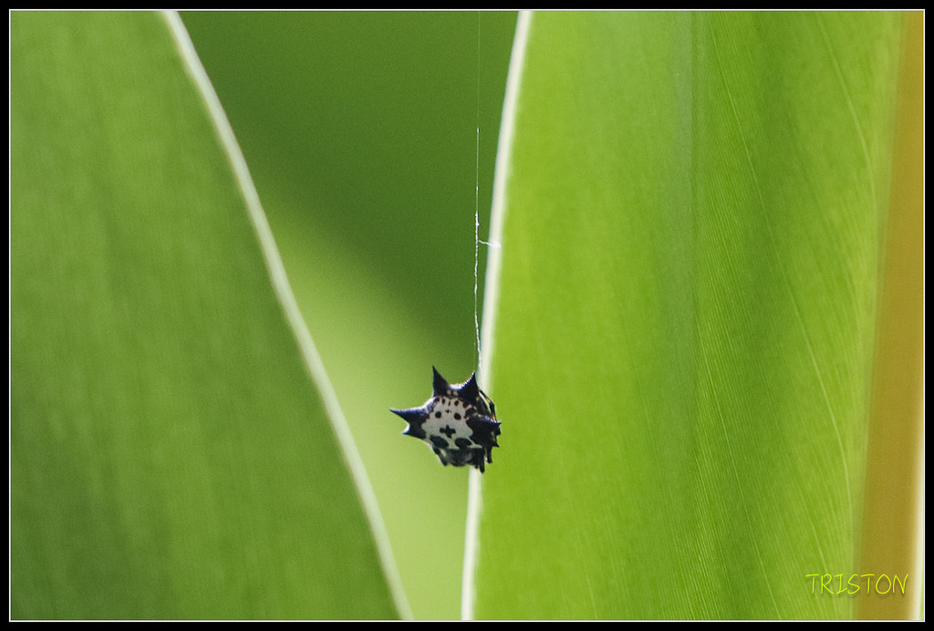 形態很奇怪的古氏棘蛛,黑白二色,據說許多蜘蛛的腹部軟而富彈性,棘蛛的腹部特化成堅硬的質感,並進一步產生具有物理性防禦功能的尖刺,吊在半空中,蠻詭異的