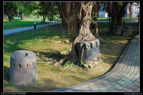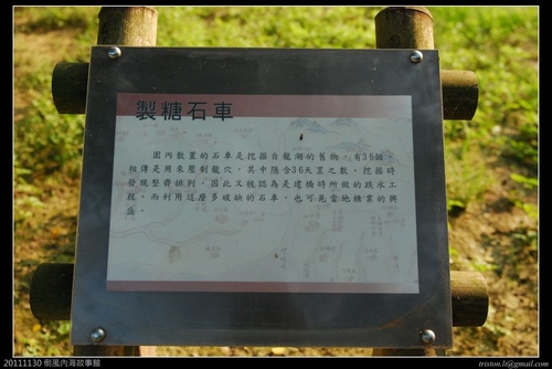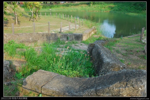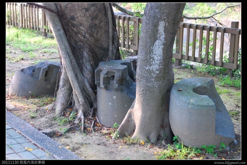碼頭坡道末端還可以看到石車的遺跡。傳說中乾隆皇帝聽說這裡有出天子的風水,所以派風水師以36個製糖用的石車填入水池,破了這裡的風水。然後原本在這裡鎮守的五府千歲出走,漂流到南鯤鯓,所以南鯤鯓代天府的千歲