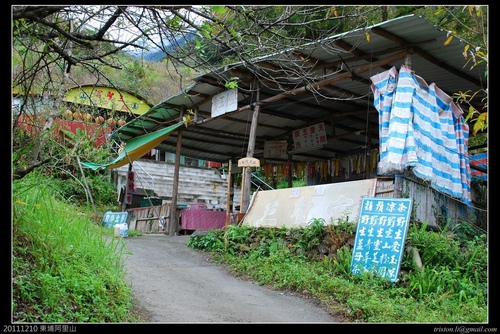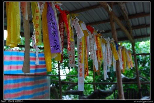 開始下雨了,就先在此休息片刻,棚架上結滿了各大登山團體的繫帶,真是壯觀!頗有"若想由此過,留下買路財"的快意!
