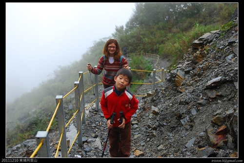 父子斷崖的由來,是因為該地路徑陡峭,山壁易落石坍方,地勢非常險惡,父子如果同行,因恐父救不了子、子救不了父的驚險而得名。不過今天霧雨濛濛,的確不太適合往前走了,但是這裡的岩理和斷層破碎面明顯,剛好找空地給小朋友上個地球科學的板塊運動。自從看了"2012"的末日電影後,小朋友問了不少板塊運動的題目,今天就一併實地上了堂地質課。