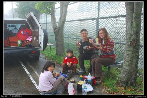 下山,車還在,驅車至開高巷的托兒中心的籃球場,今天的中餐就在此解決了。把傢俬都擺上來吧。一具爐頭,一點高山瓦斯,就可以弄出一頓飯囉!我們可真夠簡約的啦!