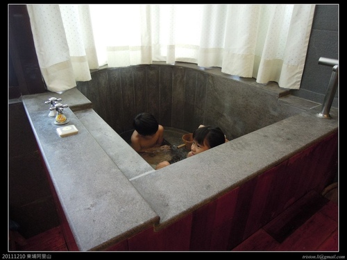 今天入住東埔帝綸溫泉飯店,帝綸是老飯店,走廊的地板竟然是磨石子,訂了湯屋一間,最高興的還是小朋友,這偌大的溫泉池就歸他們玩耍了
