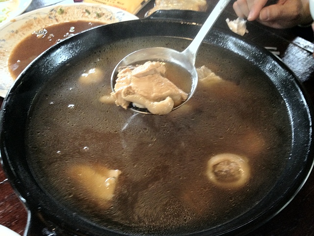 還有一道咖啡雞湯,老實說,湯的口味不錯,咖啡的氣味濃郁,把雞的肉味化為清香,但是雞肉就硬了一點,所以勉強啦!但是老闆娘很好玩,因為我們因為點了許多菜又二輪,又叫了飯,想請她再加點湯,老闆娘斷然拒絕了,她說,湯的比例有固定,每鍋的湯水是2000cc.沒有多的湯了,一副遵守標準作業程序S.O.P.的口氣。我們也只好心服口服。