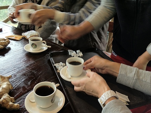 咖啡上場,自家種的咖啡豆,也是老闆自己花時間自己慢慢地剝,徐徐地烘,淺淺地焙的,當然也是老家的"自慢"口味,不喝會後悔的那種,我們當然自然不能受不得刺激,全點了。