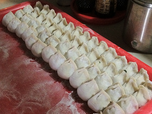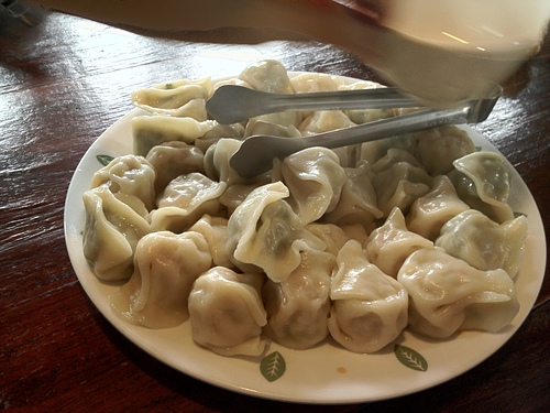 我們一共點了七十個山茼蒿和高麗菜水餃(其實都看老闆娘的安排,我們只是點頭如搗蒜的答應)...山茼蒿的味道,我也不會形容,像是淡淡的芫荽或紫蘇味,不過老闆娘手作沾醬更香,但是有點辣!