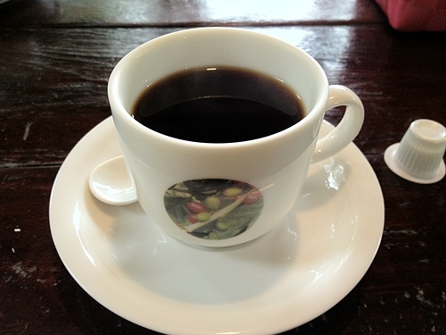 標準的東山咖啡,味道聞起來挺濃,喝起來也很順口,但是留在口中的喉韻,滑滑順順的,不苦不澀,老實說沒太大印象,心中都還掛念著剛剛才收拾的菜色!但是這裡的咖啡喝了真的不會讓人睡不覺,這點倒是我可以保證的,回台南的路上,在國道上我是一邊捏著大腿,一邊差點入定,下次可能真要備好懸樑刺股再來。