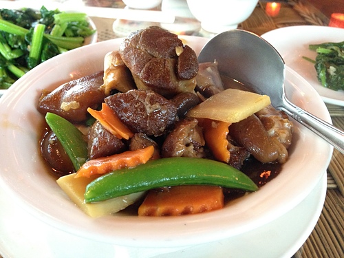紅燒豬腳,這道菜的口味是一般,豬肉有點澀,我記得白河交流道下有家虎山小站的紅燒豬腳可真好吃,而且滷到骨頭都酥了,入口即化。