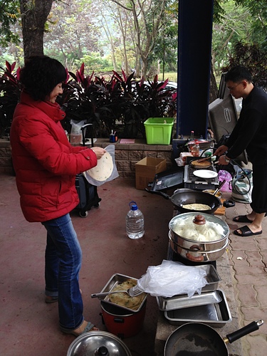 在冷冷的氣溫下,把自己包進熱呼呼的睡袋中,今夜特別好睡,一覺醒來,都己經七點多!帳篷外慢慢出現人聲,開始有人在備早餐囉!出去一看,今天的早餐竟然還有蒸包子,在外面吃的簡直比在家還豐盛!