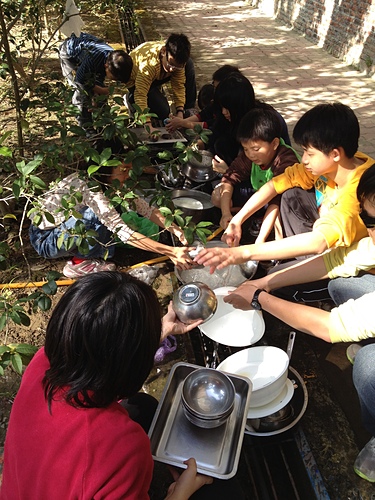 早餐的餐具,依往例,由所有的小朋友負責,我們這一團的小朋友,都要參加做家事!搭帳篷,洗碗,清潔環境,2012年可能還要安排個小朋友上菜秀哦!!!