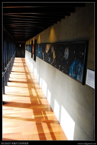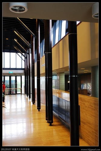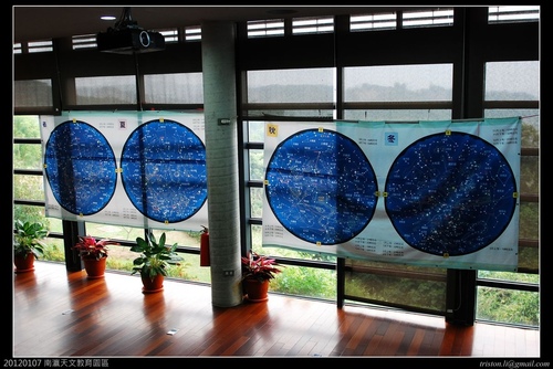 室內大廳的觀景窗上掛著春夏秋冬四季的星圖,這是我覺得較沒有融入整體設計的地方,四幅掛圖雖然提供了有用的資訊,卻遮住了大面採光觀景窗,如果改成四大片強化玻璃,並在玻璃上點出星圖不知道會不會好一點....