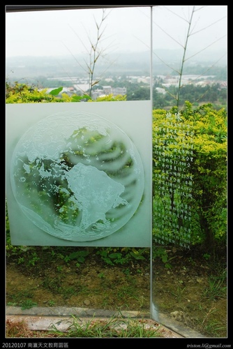 庭院外豎立著玻璃並介紹砂磨出天文相關知識,不過幾片玻璃在外面風吹日曬可能熱脹泠縮已經冰裂.....