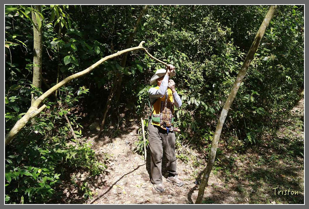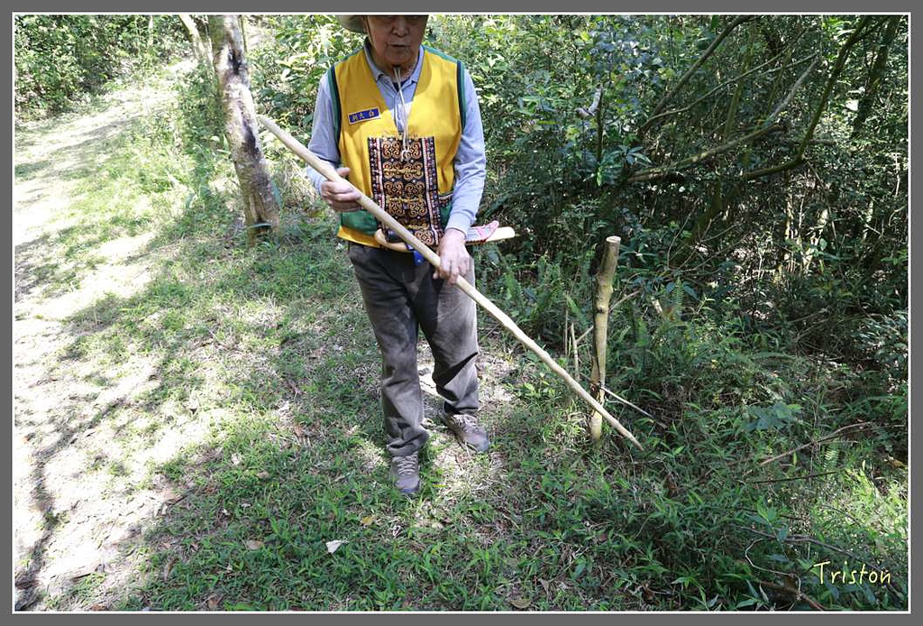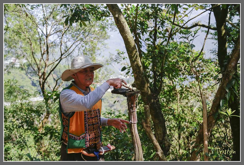 捕山豬的吊掛式陷阱就厲害了,看到那麼一大根樹枝,我們馬上閃的好遠,看柯大白Buvu輕鬆用樹葉埋住陷阱,提醒要拍了,放手彈開樹條,假想整頭山豬被麻繩套住倒吊起來,掙扎嚎叫。就像電影阿凡達一樣,他們會用最快速的方法結束獵物的生命,讓牠們受到最少的痛苦,原住民打獵是為了生存需要,而不是一種西方社會式的娛樂!
