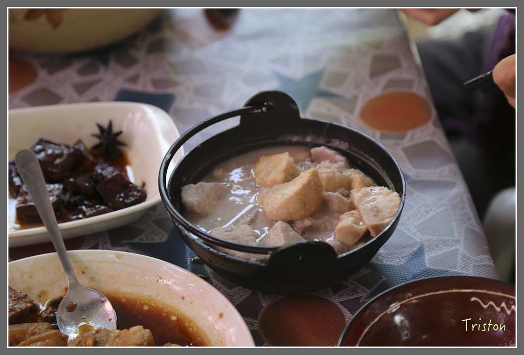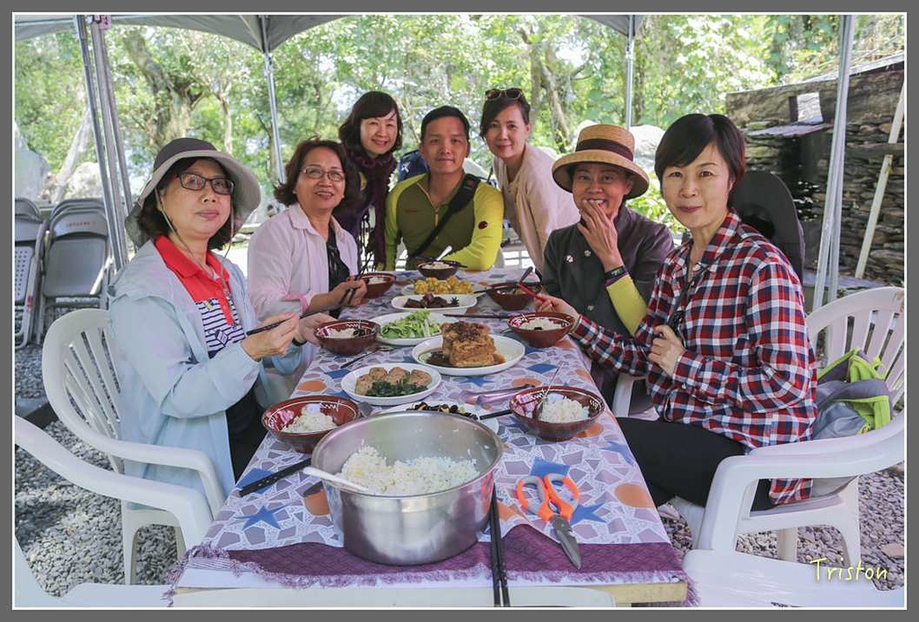 搗完又喝了咖啡,每個人都嗷嗷待哺,餓死了,終於部落主廚包金茂大哥12點下課了,由國小趕過來下廚,讓我們好好的品嚐部落風味餐。除了排灣族的傳統美食『吉拿富』,山上的『有機木耳』和『紅藜飯』、添加樹豆的東坡肉,樹豆丸子湯。